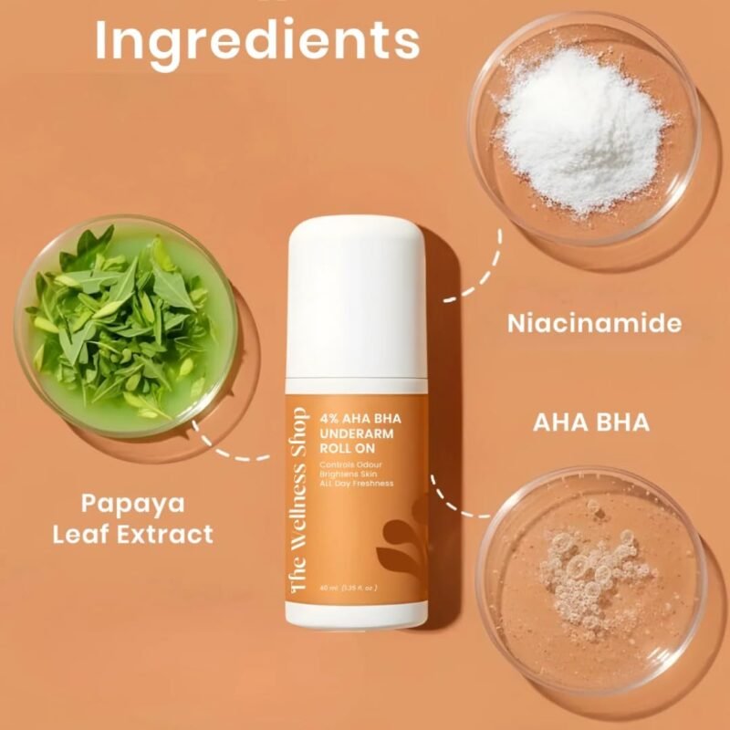 The Wellness Shop 4% AHA BHA Underarms Roll-On (40ml) | Niacinamide & Papaya Leaf Extracts | Reduce Pigmentation & Odour | Brightens & Evens Skin | Non-sticky & Long-Lasting Freshness | Unisex