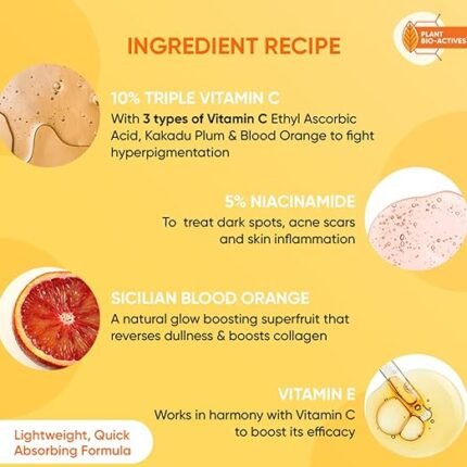 - Triple Vitamin C Brilliance: Our 10% Vitamin C serum contains Triple Vitamin C which effectively treats dullness and hyperpigmentation, unveiling even toned, glowing skin. Unique blend of triple Vitamin C brings together brightening properties, antioxidant benefits, and collagen production for a radiant and youthful look.