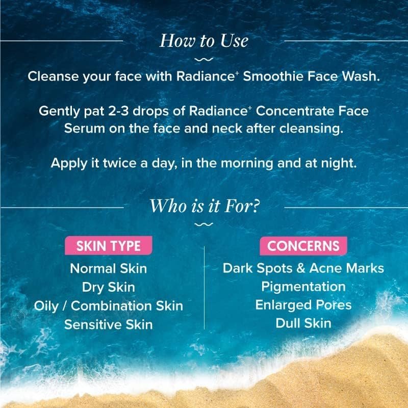 - Enables tightening of pores: Aqualogica Radiance+ Concentrate Face Serum is packed with Watermelon and Niacinamide that provides your skin with adequate hydration and reduces pore visibility to give you youthful skin.