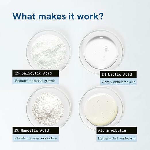 • PROMOTES SMOOTHER & BRIGHTER UNDERARMS: 2% Lactic acid & 1% Salicylic acid gently exfoliate dead skin cells and help to speed up cell turnover and cell renewal to reveal newer, fresher, smoother skin. 1% Mandelic acid helps boost collagen production resulting in radiant underarms. Alpha arbutin reduces melanin production, fades dark spots & pigmentation by evening under-arm discoloration.