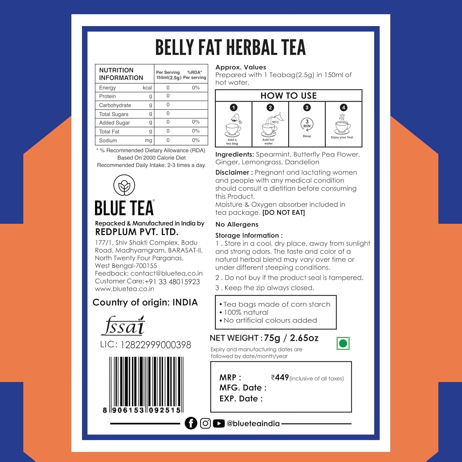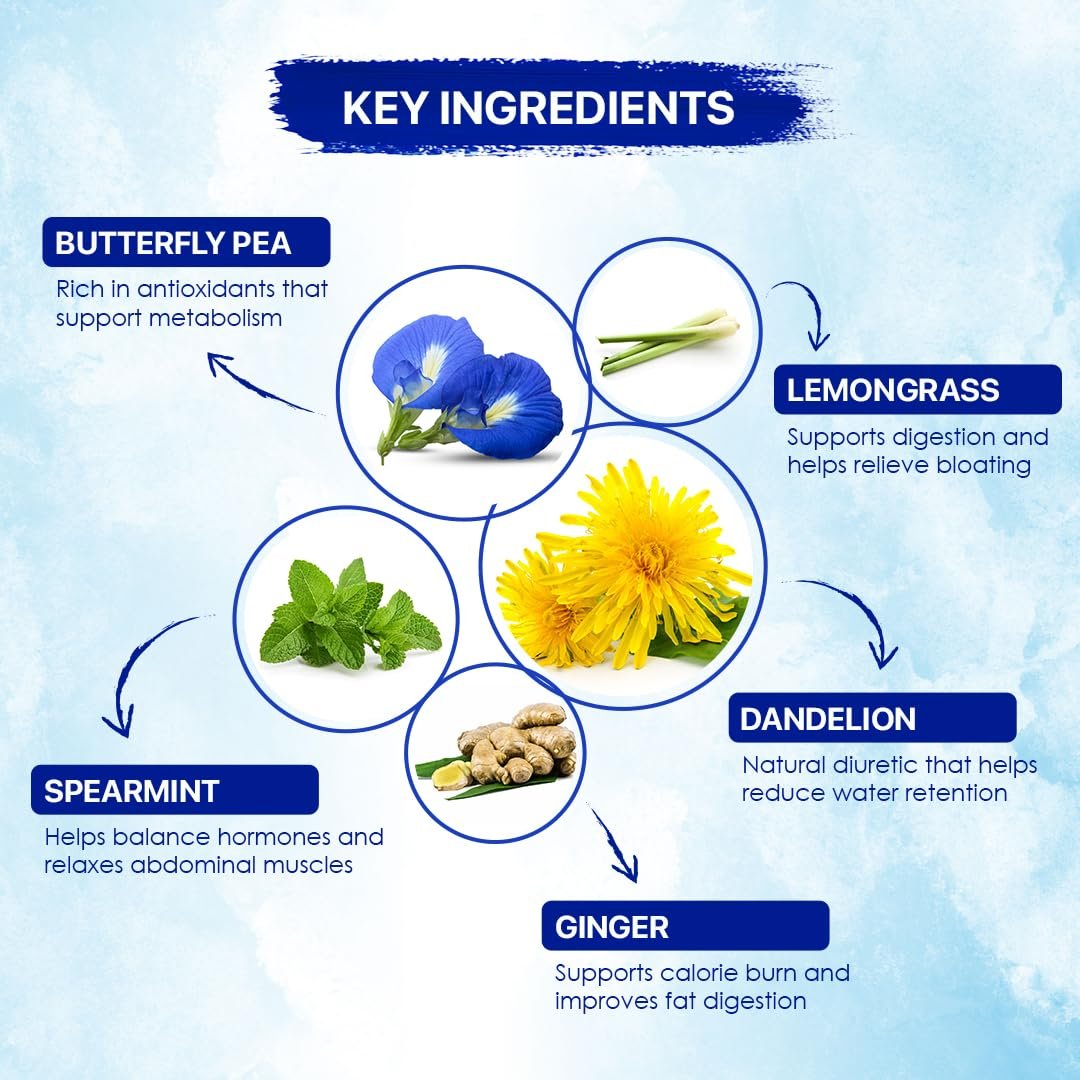 - INGREDIENTS: Blue tea belly fat herbal tea is infused with dandelion for natural detox, ginger to stabilize blood sugar, lemongrass to support digestion, spearmint to curb cravings, and butterfly pea to ignite metabolism. Sip on this revitalizing belly fat tea to tone your tummy and speed up your weight loss journey.