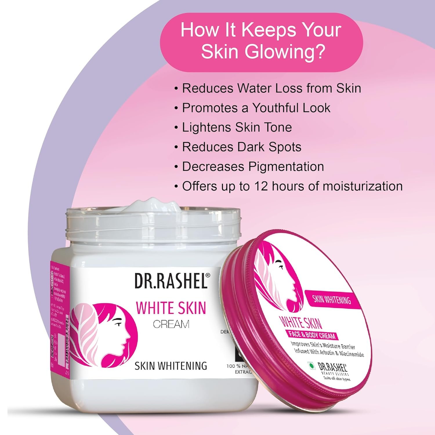 Dr.Rashel Skin Whitening Face Cream is formulated with combination of Niacinamide and Arbutin which helps to retain moisture in the skin by reducing water loss from skin, giving you a smoother, youthful look.
