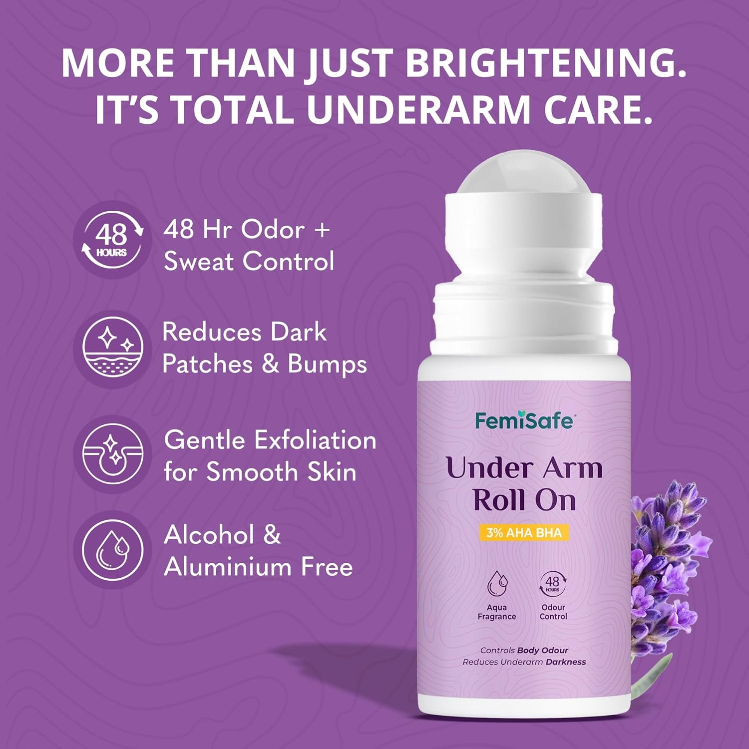 FemiSafe 3% AHA BHA Underarm Roll-On|Controls Odour & Reduces Pigmentation | Alcohol-Free | Antiperspirant with 48H Protection | Unisex Roll-On (50ml)