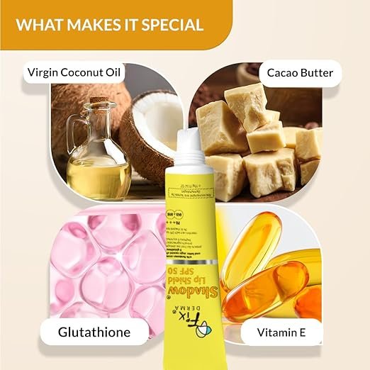 FIXDERMA Shadow SPF 50 Lip Shield PA+++ Lip Balm SPF 50 With Theobroma Cacao Seed Butter,Virgin Coconut Oil & Glutathione Prevents Pigmentation & Sun Damage Sun Protector UVA & UVB-15gm,Yellow