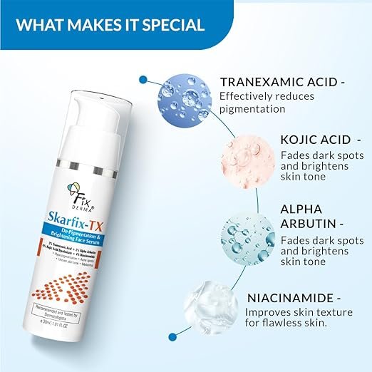 - FIXDERMA’S Skarfix-TX Face Serum is the ultimate solution to target pigmentation, dark spots, and uneven skin tone.