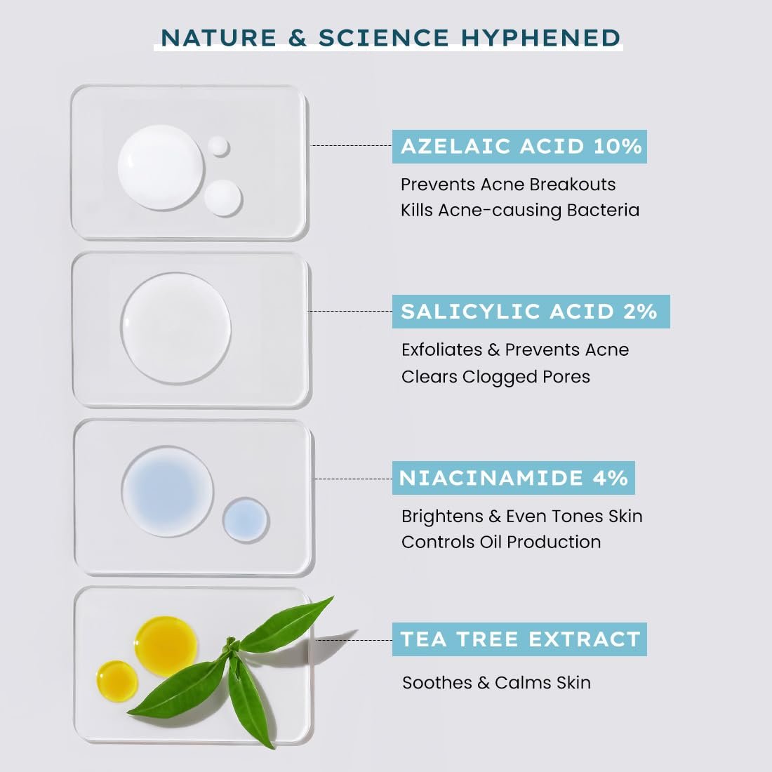 - CONTROL OIL, CALM & SOOTHE REDNESS: Niacinamide 4% controls oil production and smoothens the skin. Tea Tree Extract soothes redness, swelling, and inflammation.