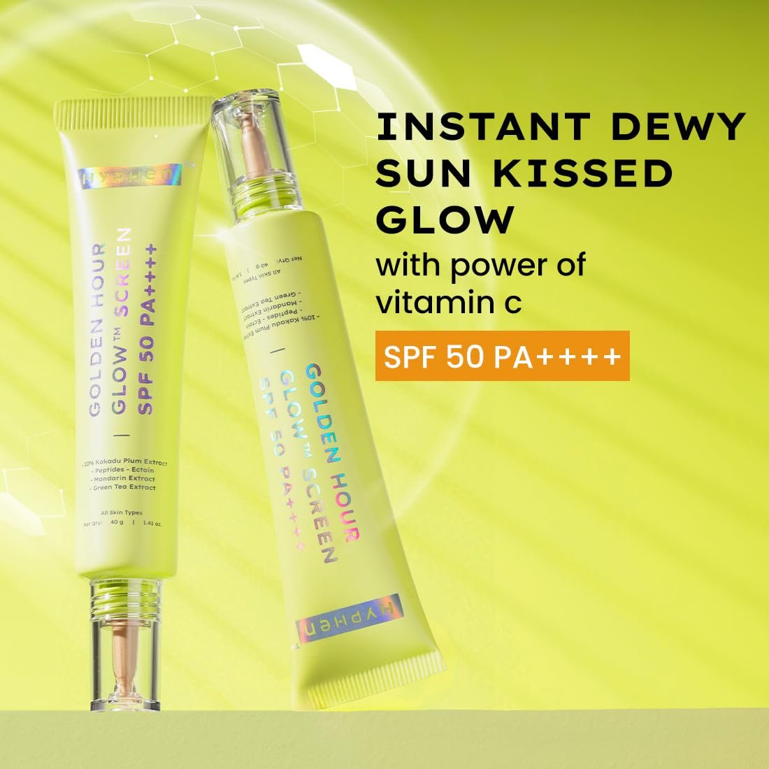 Hyphen Golden Hour Glow Sunscreen Spf 50 Pa++++ Dewy Glow & Bright Skin| Vitamin C Rich-10% Kakadu Plum & Peptides| Winter Sunscreen Moisturizer for Women & Men|Lightweight & Non Greasy, Uv & Blue Light Protection|Dry & All Skin Types – 40G