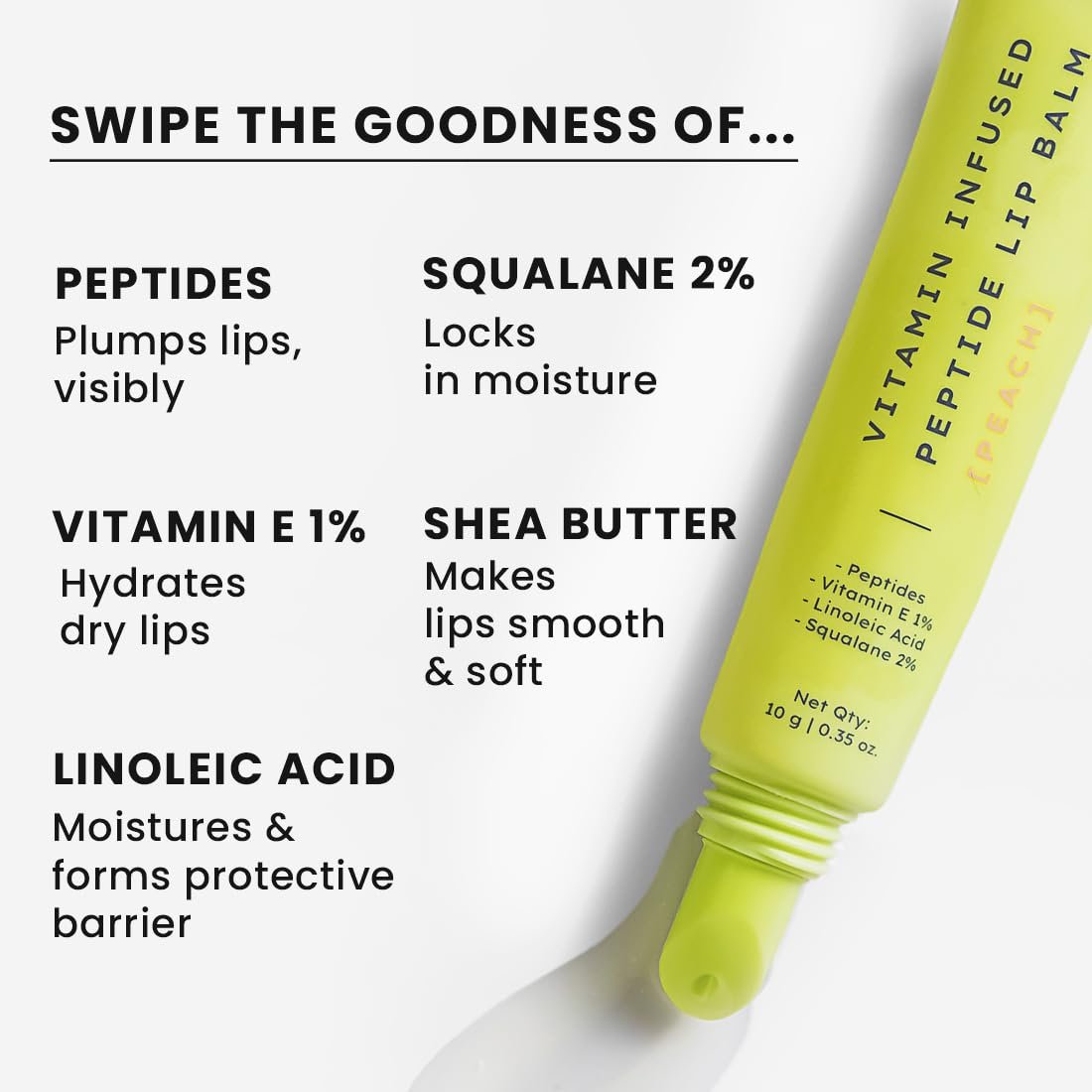- HYDRATES & MOISTURIZES DRY LIPS: Our Vitamin-Infused Peptide Lip Balm in Peach provides deep hydration, rescuing even the driest of lips with a 24 Hrs moisture lock. Say goodbye to dehydrated, chapped lips with our balm’s unique formula with the goodness of Peptides, Vitamin, Squalane, etc. that helps leave your lips soft and juicy.