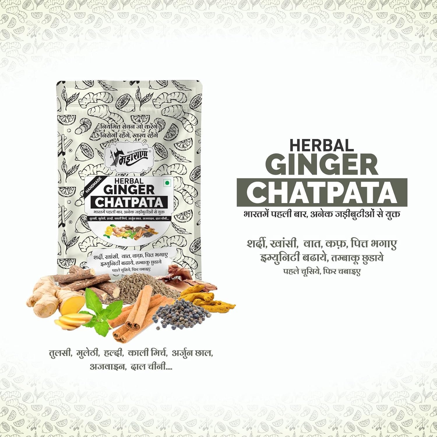 - Herbal Ginger Chatpata strengthens the digestive process and also promotes absorption of nutrients. It stimulates the digestive enzymes and acts as an immunity booster. Indian after-meal Herbal Ginger Chatpata or ginger widely used as a mouth freshener, especially after meals. ginger Dramamine Hand Made, Mouth-watering Flavor & Aroma, Authentic Indian Taste, Premium Packaging. Adrak pachak is made out of rich quality ingredient.