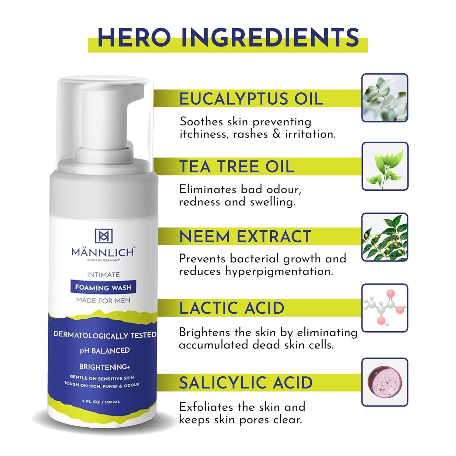 Mannlich Intimate Wash for Men (150 ml) Relieves Itchiness & Odour, Prevents Fungal Growth, Genital Area, pH Balanced & Dermatologically Tested With Tea Tree Oil, Neem, Eucalyptus Oil, 1% Salicylic & Lactic Acid