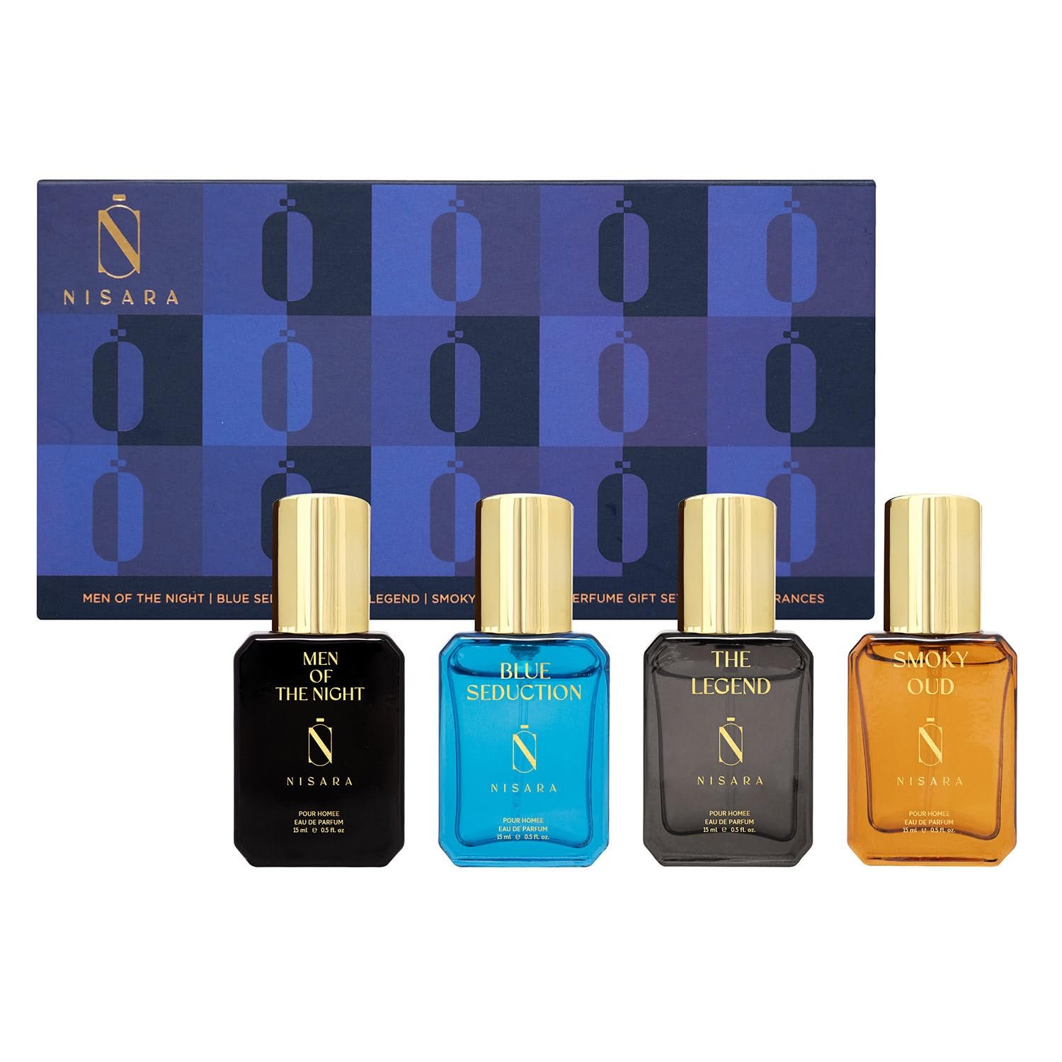 Nisara Long Lasting Men Perfume Gift Set 4x15ml(60ml) | Notes:- Citrus Musky, Fresh Aqua, Woody Oud with | Men Of The Night | Blue Seduction | The Legend | Smoky Oud | Travel & Pocket-friendly perfume kit for all moods & occasions | Ideal gift for men, Husband, Friend, Boyfriend | Premium Perfume For Men