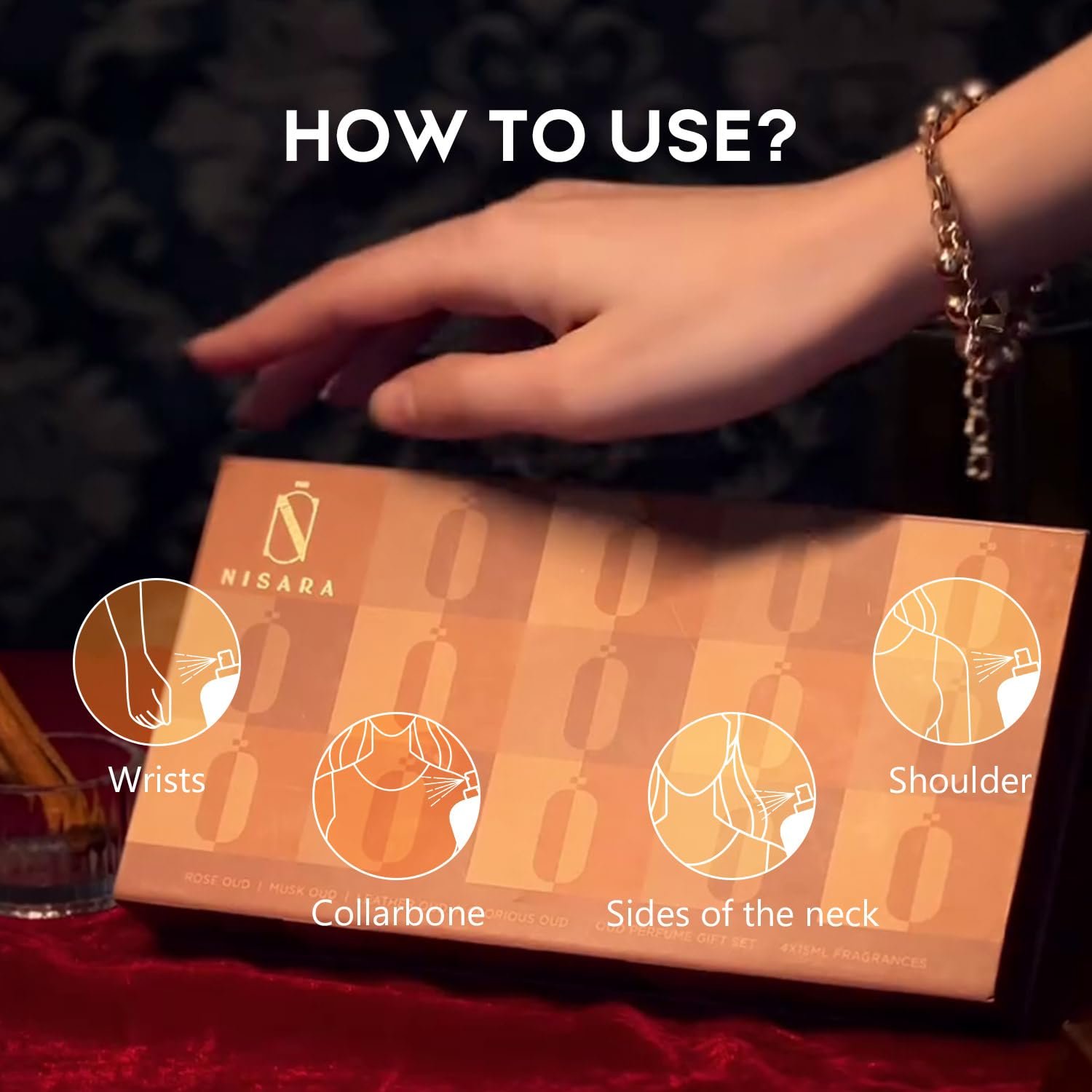 - Set of 4 Premium Fragrances: Experience the sophistication of Nisara’s luxury Oud perfumes Gift Set for Men & Women With: Rose Oud, Musk Oud, Leather Oud, Glorious Oud. Each scent is crafted with high-quality oils.