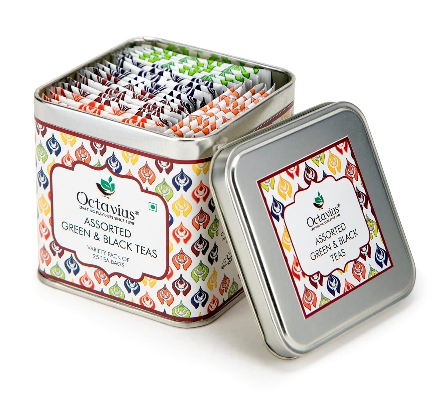 Octavius 6 Assorted Tea Flavors in Black & Green Teas in Tin Box 25 Tea Bags