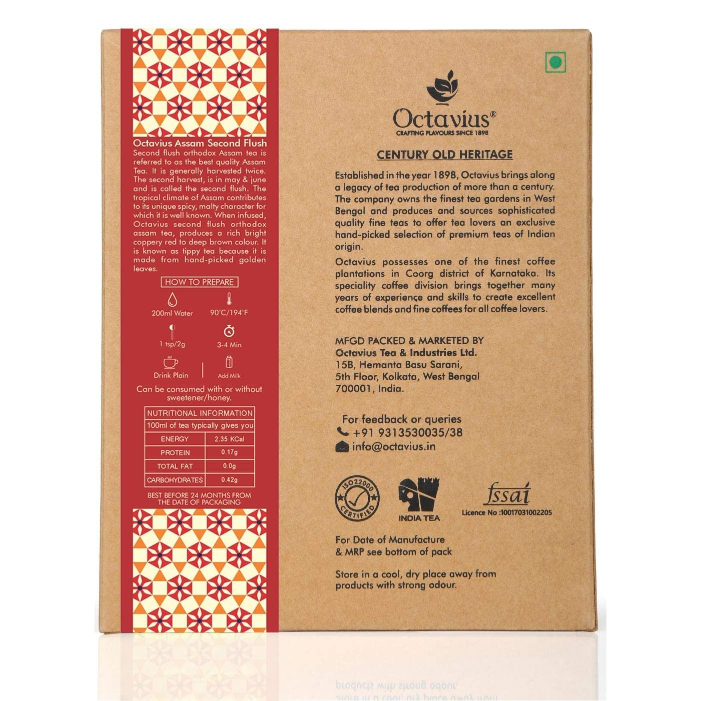 • TEA EXCLUSIVELY CHOSEN BY VETERAN TEA TASTERS – Octavius Indian Masala Chai, is a blend of strong and full bodied premium black tea and natural exotic Indian dry spices which include cardamom, ginger, cloves,black pepper and cinnamon.This blend when brewed with milk creates the perfect cup of tea tasting just like the homemade masala chai.