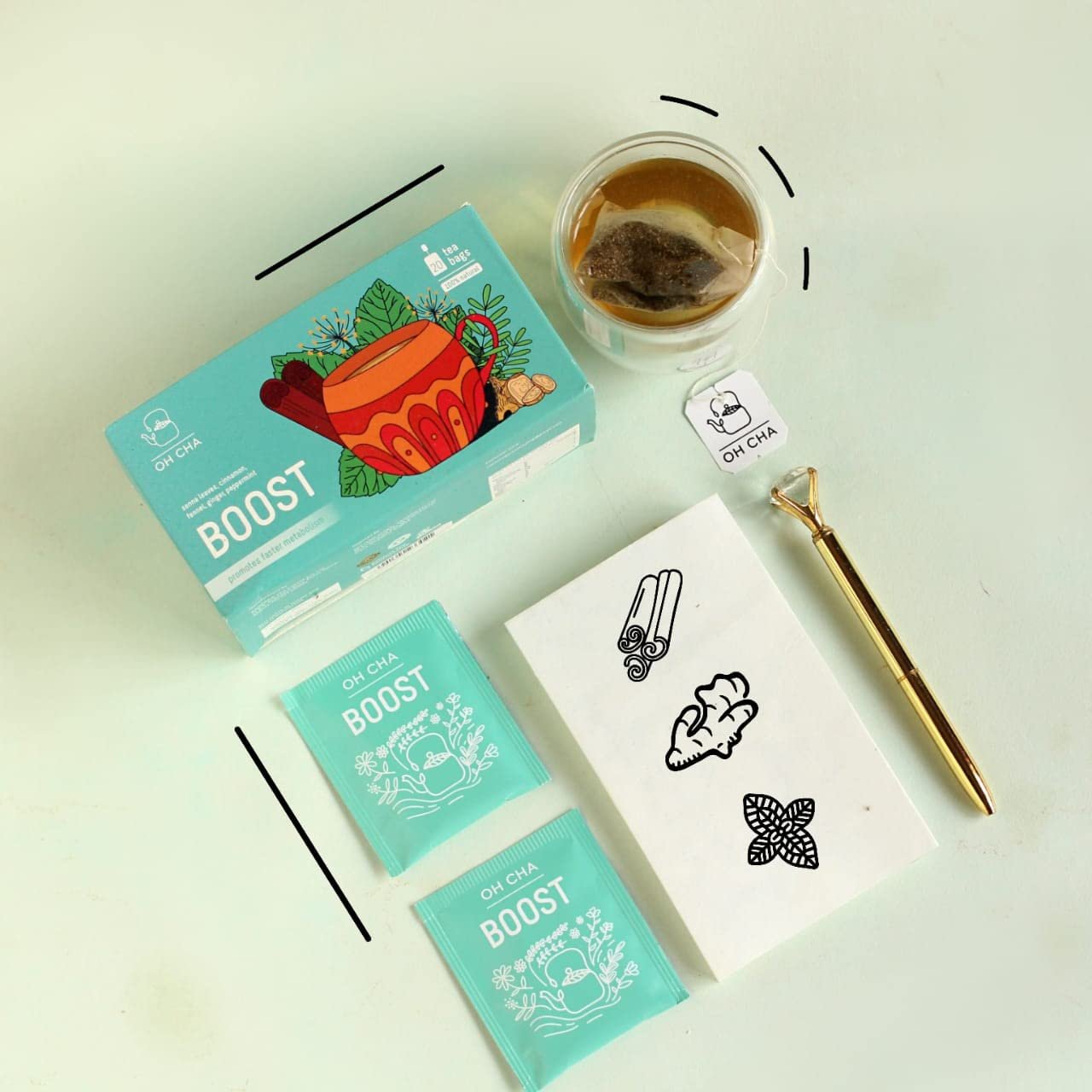 OH CHA – Green Tea Bags, Boost | Energy Boosting Tea with Peppermint, Senna leaves, Cinnamon, Ginger, Fennel seeds | 100% Natural Ingredients, Green Tea for Weight Loss | Everyday Wellbeing Drink | 20 Tea Bags