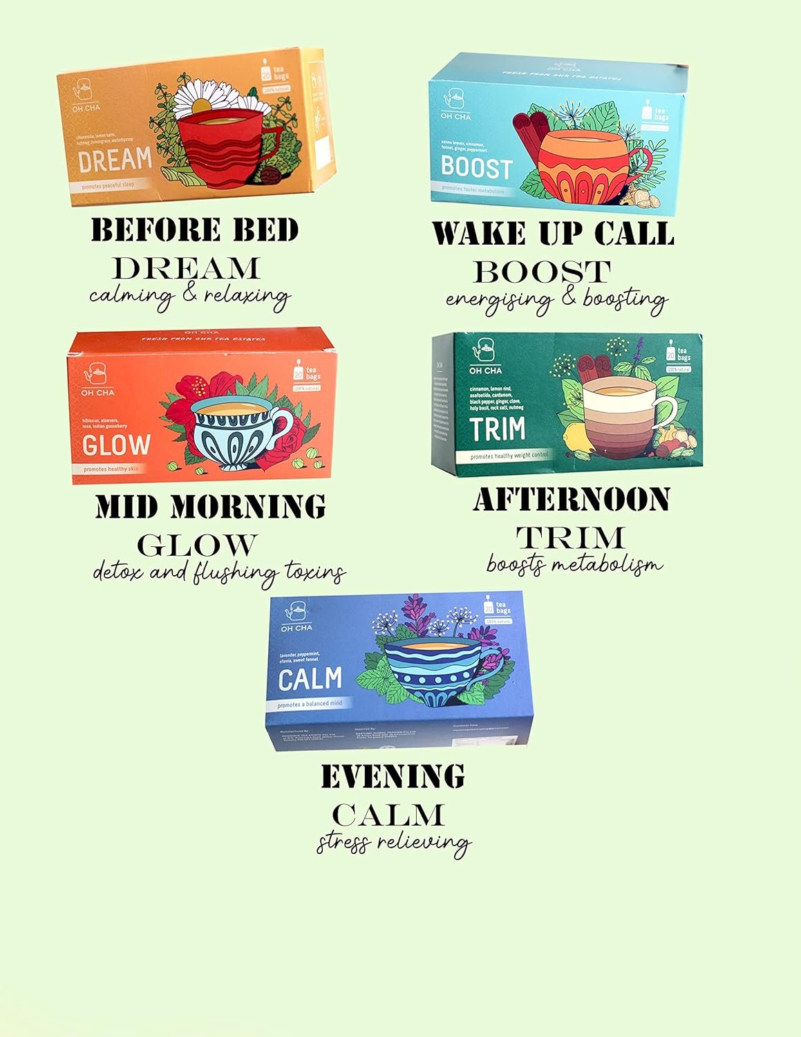 - WHAT’S OH CHA ABOUT IT? We blend our green tea with an energizing blend of real peppermint leaves that beautifully and artisanally balances the best of what green tea has to offer. Discover aromatic notes in this exquisite blend combined with senna leaves, cinnamon, ginger, fennel seeds it makes for a mild, malty and warm experience. A first-of-its-kind, this velvety liquor is as deep as its refreshing which lingers long on your palate with the minty flavor enveloping every sip.