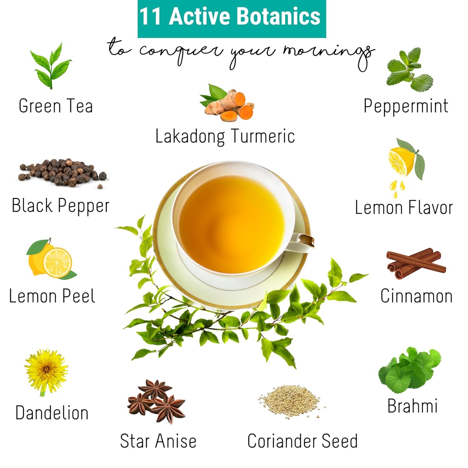100% Natural Green tea, Lakadong Turmeric (Best Quality Turmeric), Coriander Seed, Black Pepper, Cinnamon, Star Anise, Dandelion, Brahmi, Lemon Peel, Peppermint, Lemon Flavor