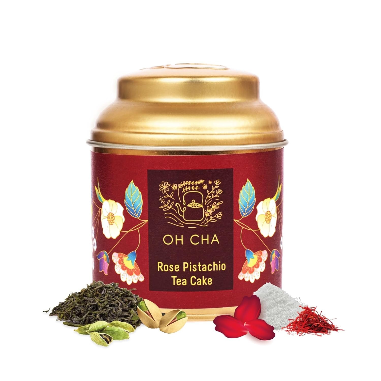 OH CHA – Rose Tea Pistachio | Rose Green Tea with Kashmiri Saffron, Sun-dried Natural Rose Petals, Pistachio, Cardamom & Stevia leaves | Natural Care Tea for Glowing Skin & Hair | 35g Tin Caddy