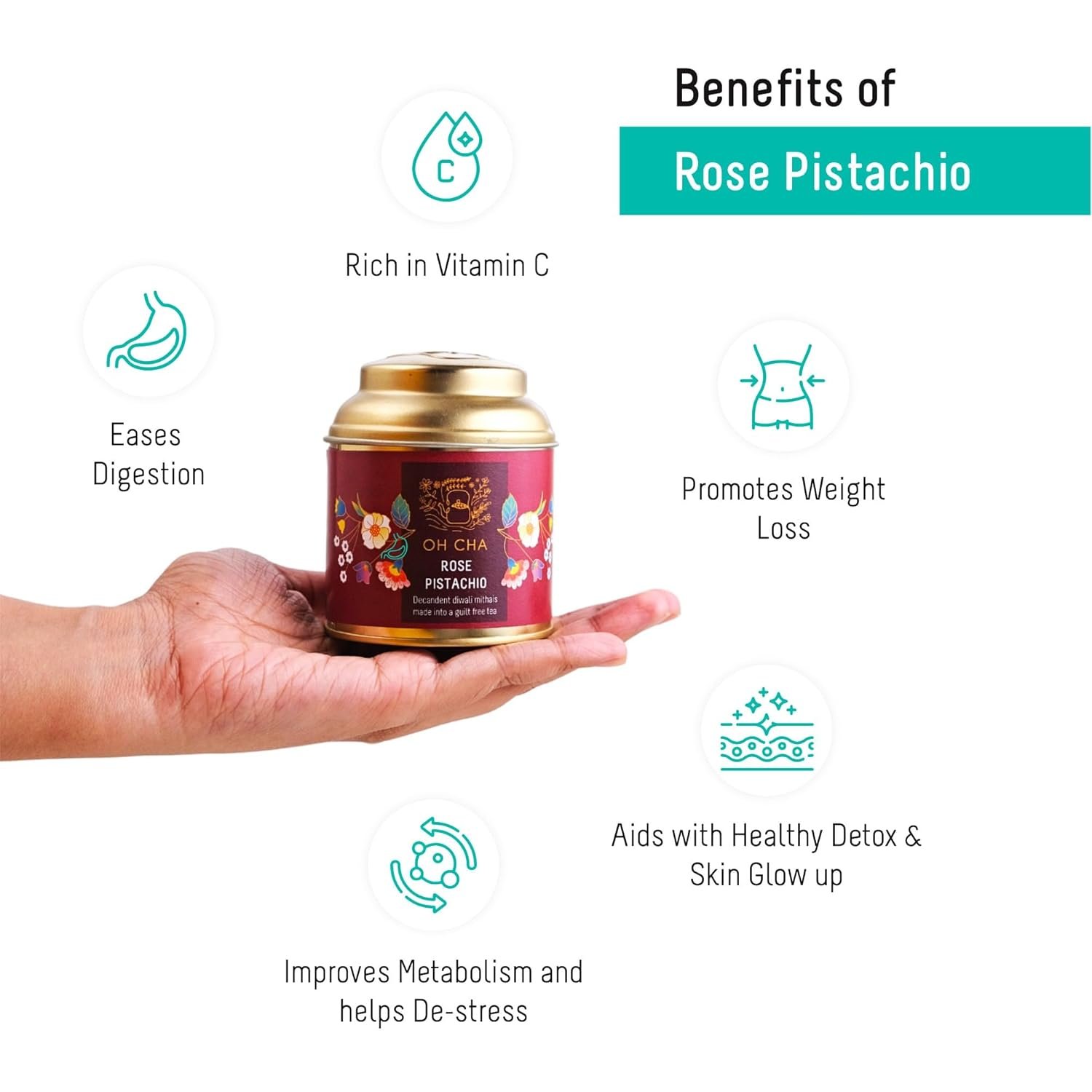 - WHAT’S OH CHA ABOUT IT? An exquisite rose flower tea blend that helps with weight management starring the beloved yet humble pistachio nut and earthy, aged stevia along with a beautiful spicy kick of cardamom and the tangy sweetness of rose petals. Whether or not you like rose-tinted tales, you’re sure to fall head over heels for our rose-flavored pistachio tea. And to make you really wake up and smell the roses and the earthy nuttiness of pistachios, it’s delicious hot or iced!