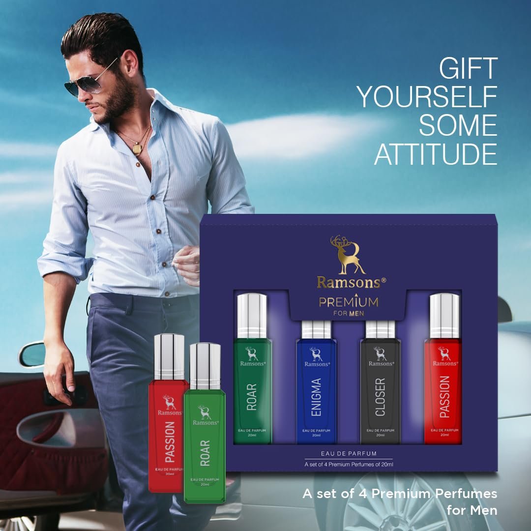 Ramsons Closer, Enigma, Roar & Passion Premium Eau De Parfum Gift Set For Men (Pack Of 4 X 20ml) | Long Lasting Luxury Perfume | Birthday Perfume Gift Set For Him