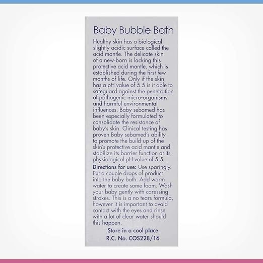 Sebamed baby bubble bath has pH of 5.5 and has extra mild sugar based cleanser. Baby Bubble Bath is an extremely mild foaming bath additive with good cleansing properties. It strengthens the resistance of baby skin with the physiological pH of 5.5. At pH 5.5 alone the skin barrier remains intact. It has been clinically proven that only at pH 5.5, the lipid and moisture loss is minimum and the growth of pathogenic bacteria is restricted. Conventional bubble baths have pH7 and chemicals like formaldehyde, phthalates, SLS which leads to allergic reactions. Sebamed baby bubble bath has chamomile which soothes irritated skin and has anti bacterial properties. Due to the special combination of active ingredients, baby bubble bath causes no irritation of the eyes the dreaded tears and stinging. Made in Germany. 100 percent soap and alkali free. Extra mild tenside complex for gentle cleansing action without dehydrating. Soft controlled foaming. Natural moisturizing agents protect against dryness. Supports the natural lipid balance. Allantoin makes the skin soft and smooth. Pleasant botanical fragrance. Ideal from six month onwards. No tears formula. Clinically proven – 70 percent reduction in flaking and 100 percent increase in skin lipids within 2 weeks. [Source:- Adapted from Sebapharma product manual, Sebapharma, Germany]. 0 percent irritant reactions and almost 0 percent allergic reactions [Source:- Adapted from Sebapharma product manual, Sebapharma, Germany].