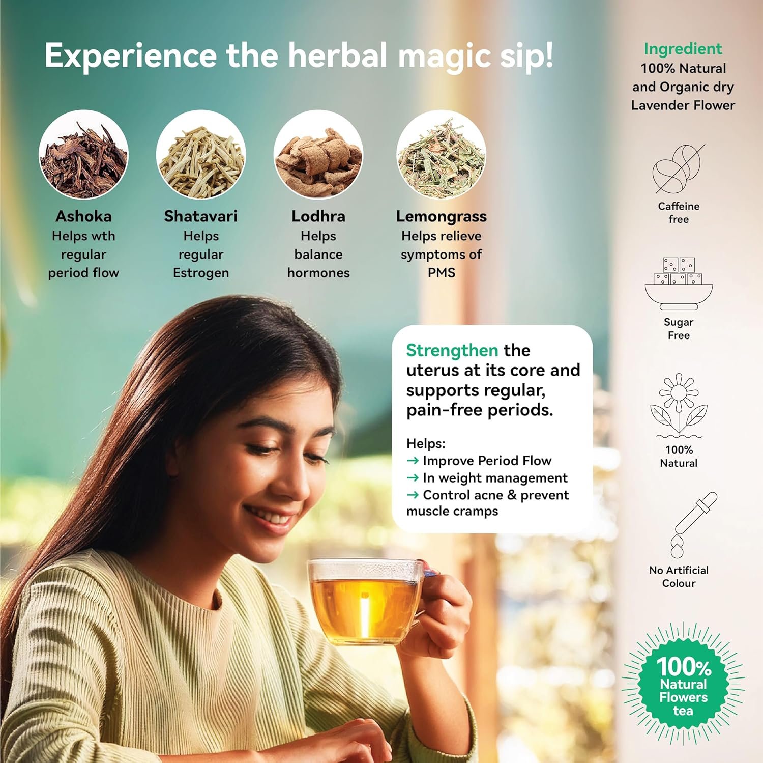 - PLEASANT AROMA & RICH TASTE β Each cup delivers a soothing aroma and rich flavor, creating a calming ritual for your daily routine. The combination of Lemon Grass and Ashoka gives the tea a refreshing scent, while Shatavari and Lodhra contribute to a deep, satisfying herbal taste that makes wellness enjoyable.