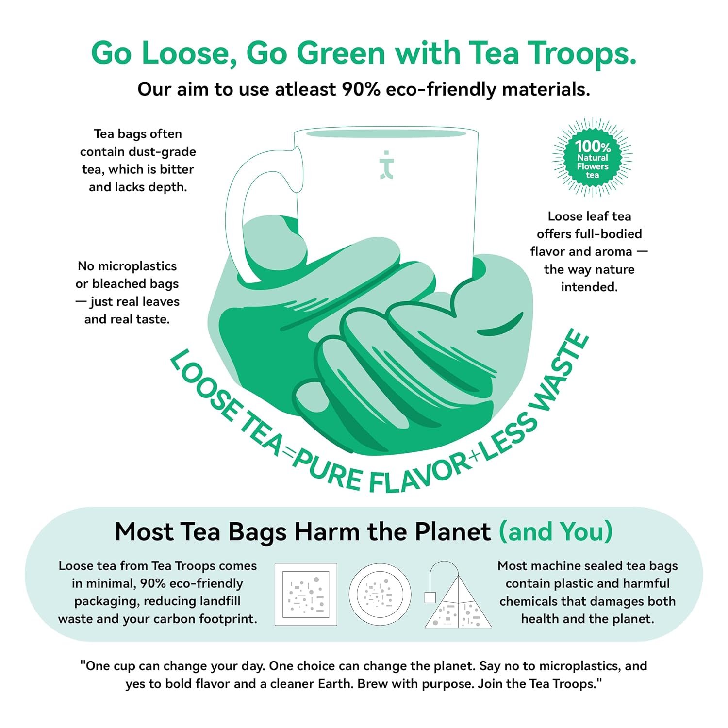 - PLANT BASED, BIODEGRADABLE TEABAGS: Our commitment to sustainability shines through in our packaging. Each Corn Starch teabag is crafted from biodegradable, plant-based materials, ensuring an Eco-conscious choice with every brew.
