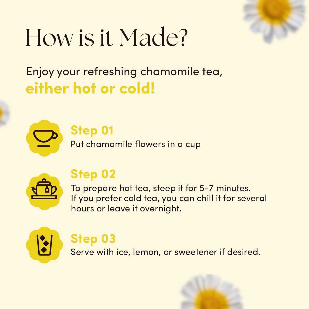 - NATURAL COLORANT FOR FOOD & DRINKS REFRESHING ICED TEA: The Tea Heaven Natural Organic Chamomile Iced Cold Tea Leaves is for your beach goals and sunny days. This yummy infusion will make drinking water much more enjoyable. Get ready to enjoy a taste paradise in an Iced Tea with our new refreshing Chamomile flover ! These Ayurvedic Flowers are used worldwide for making Iced Tea, Cocktails, and Mocktails.